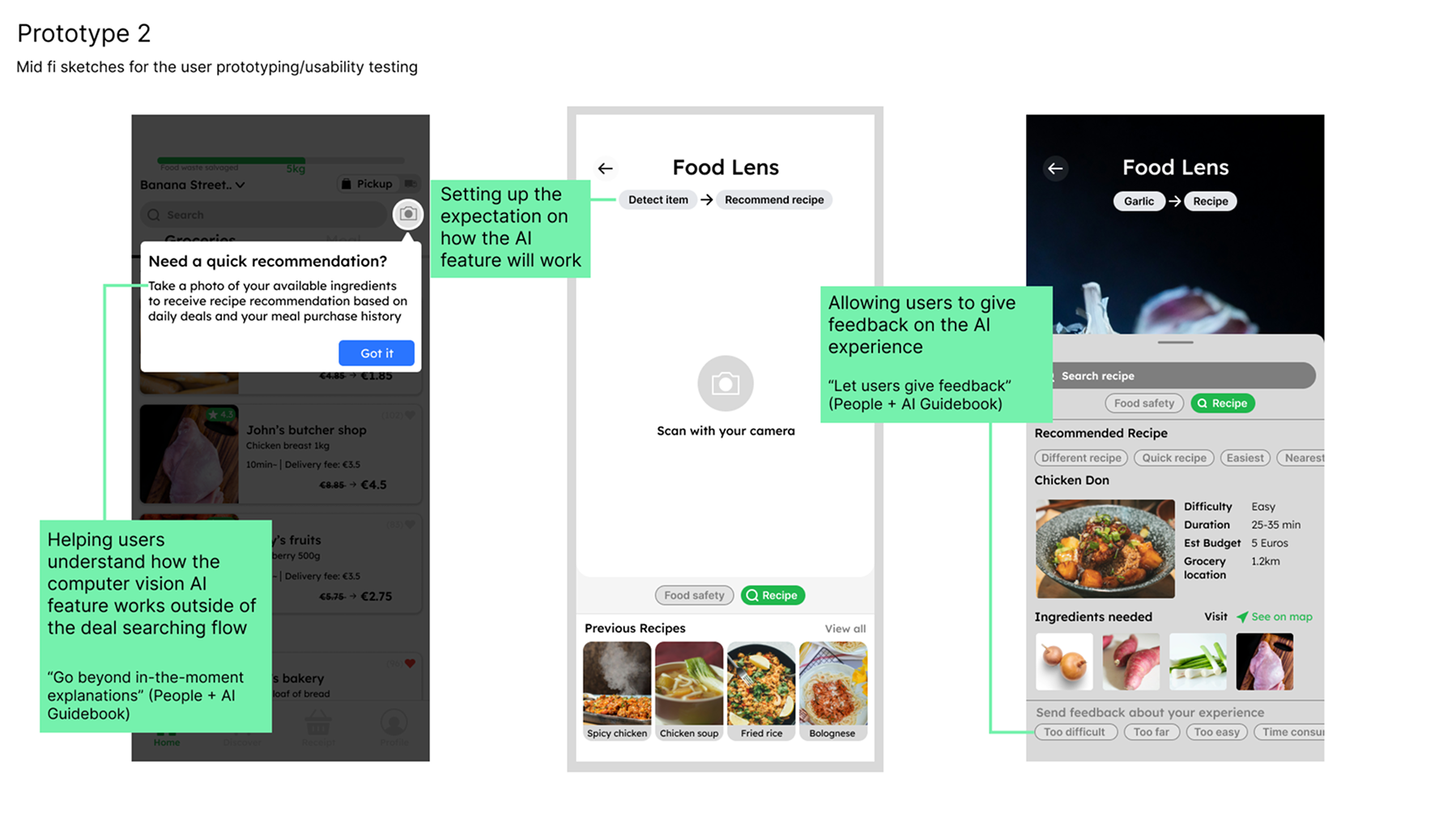 The WasteNot prototype was developed through an iterative process informed by literature research, user insights, co-design sessions, and usability testing. Early wireframes and participant feedback highlighted the importance of fast deal discovery, clear price information, and minimal cognitive load, leading to the prioritization of search, filters, and category-based browsing.