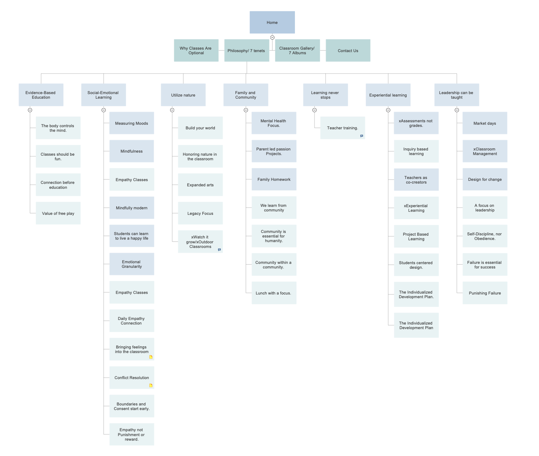 By prioritizing their mission statement (the 7 tenets) as an important content section on their new website, I need to create an IA structure that give ease to new visitors (people reading this information for the first time) and also administrative advisors and potential investors.