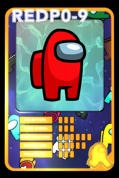 After a quick search, I found that most of the best selling NFTs have some 3D element implemented. They are either made with 3D software or a object that is animated like a 3D object. So I decided to choose a trading card. The game does not play like trading cards but I figure why not make them. First, I decided to make 5 cards based on the five space suited characters (black, blue, red, pink, and green). Then I decided to give them some attributes: investigation, deception, task speed, volatility, and bloodlust. These attributes are based on the gameplay.