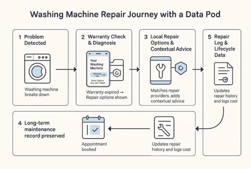 A key use case for the physical prototype is storing user-owned product data, such as warranties and repair histories, in one central place. Inspired by the Digital Product Passport framework, this allows users to make more informed decisions about durable products like washing machines or cars. By giving users direct access to product histories, the prototype lowers the barrier to repair and reuse, helping extend product lifecycles and supporting more sustainable, circular consumption practices.