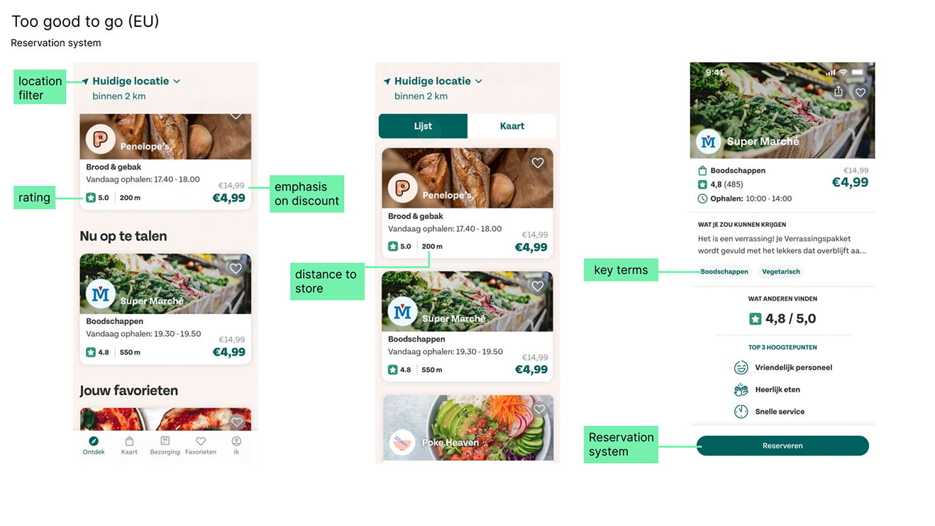 Feedback from cultural probing and usability tests further refined the interface by emphasizing price clarity over abstract freshness indicators and simplifying navigation. These research-driven iterations resulted in a focused set of features that support confident, low-effort decision-making around surplus food while directly addressing the trust and usability barriers identified in earlier research.