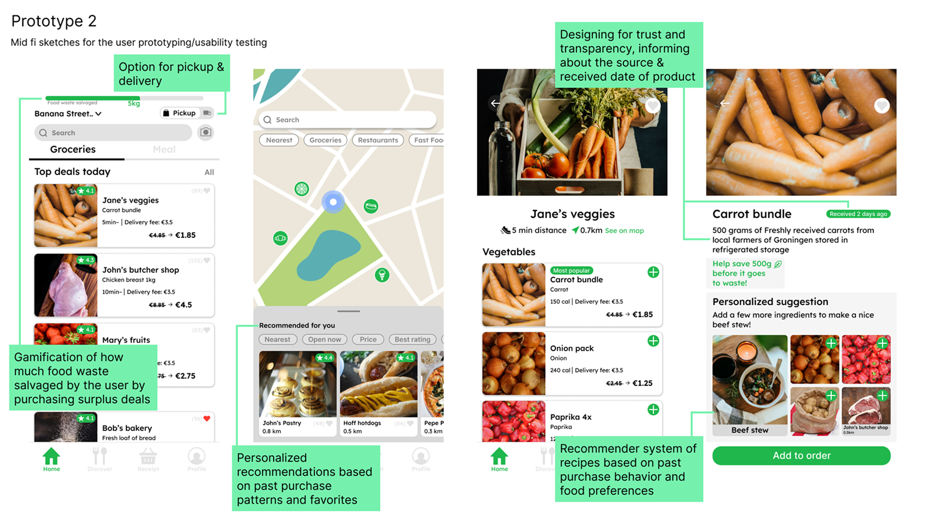 The WasteNot prototype was developed through an iterative process informed by literature research, user insights, co-design sessions, and usability testing. Early wireframes and participant feedback highlighted the importance of fast deal discovery, clear price information, and minimal cognitive load, leading to the prioritization of search, filters, and category-based browsing.